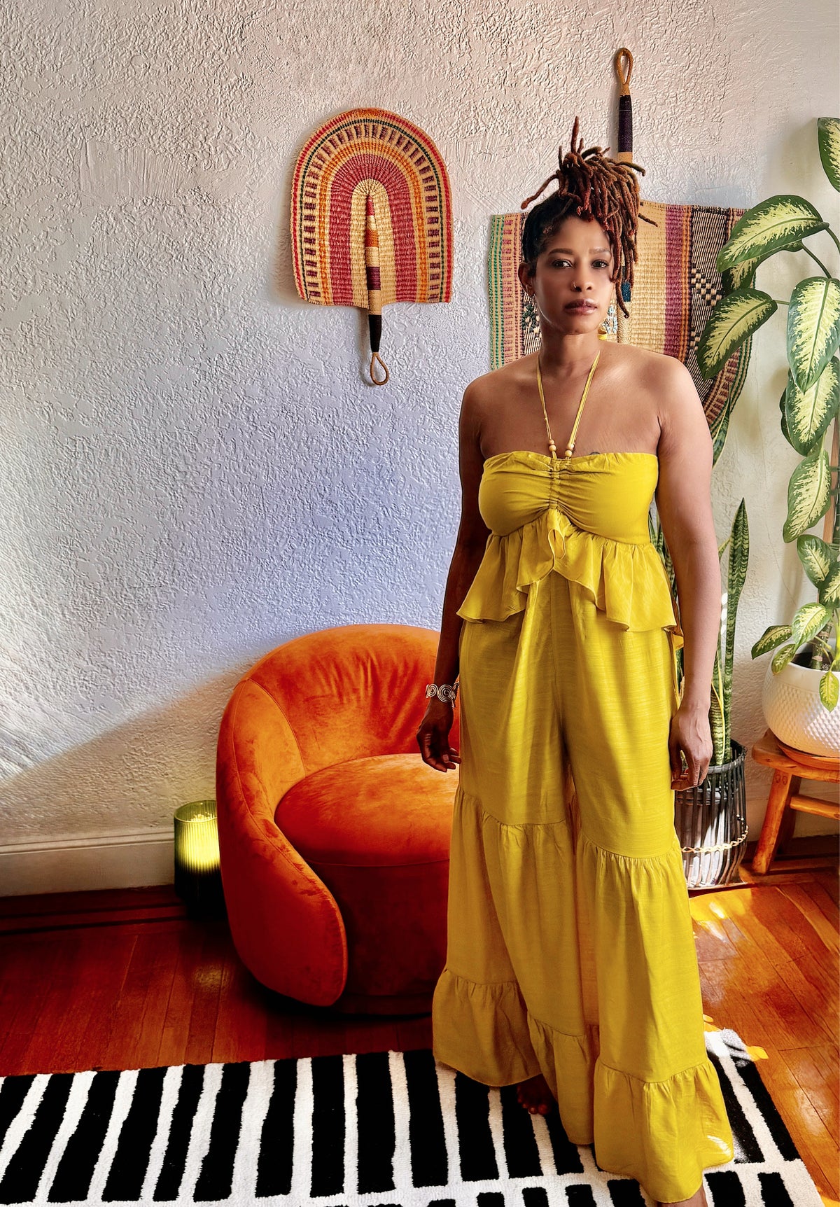 Butterfly Ruffle Romper – Mustard Linen     Light as air and bold in all the right...