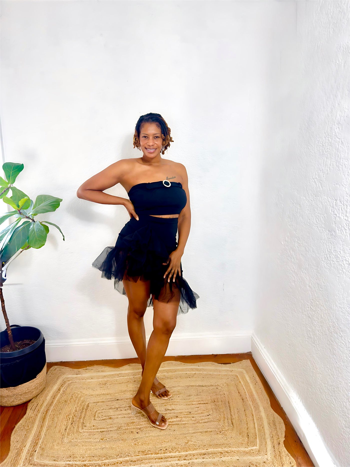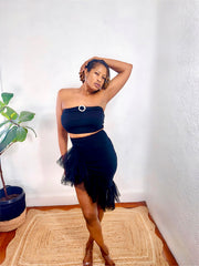 The Midnight Flirt Set brings drama and seduction in a sleek strapless cut and layered tulle detail. Designed to flirt with every step, it’s that bold-but-elegant energy your night-out wardrobe deserves.