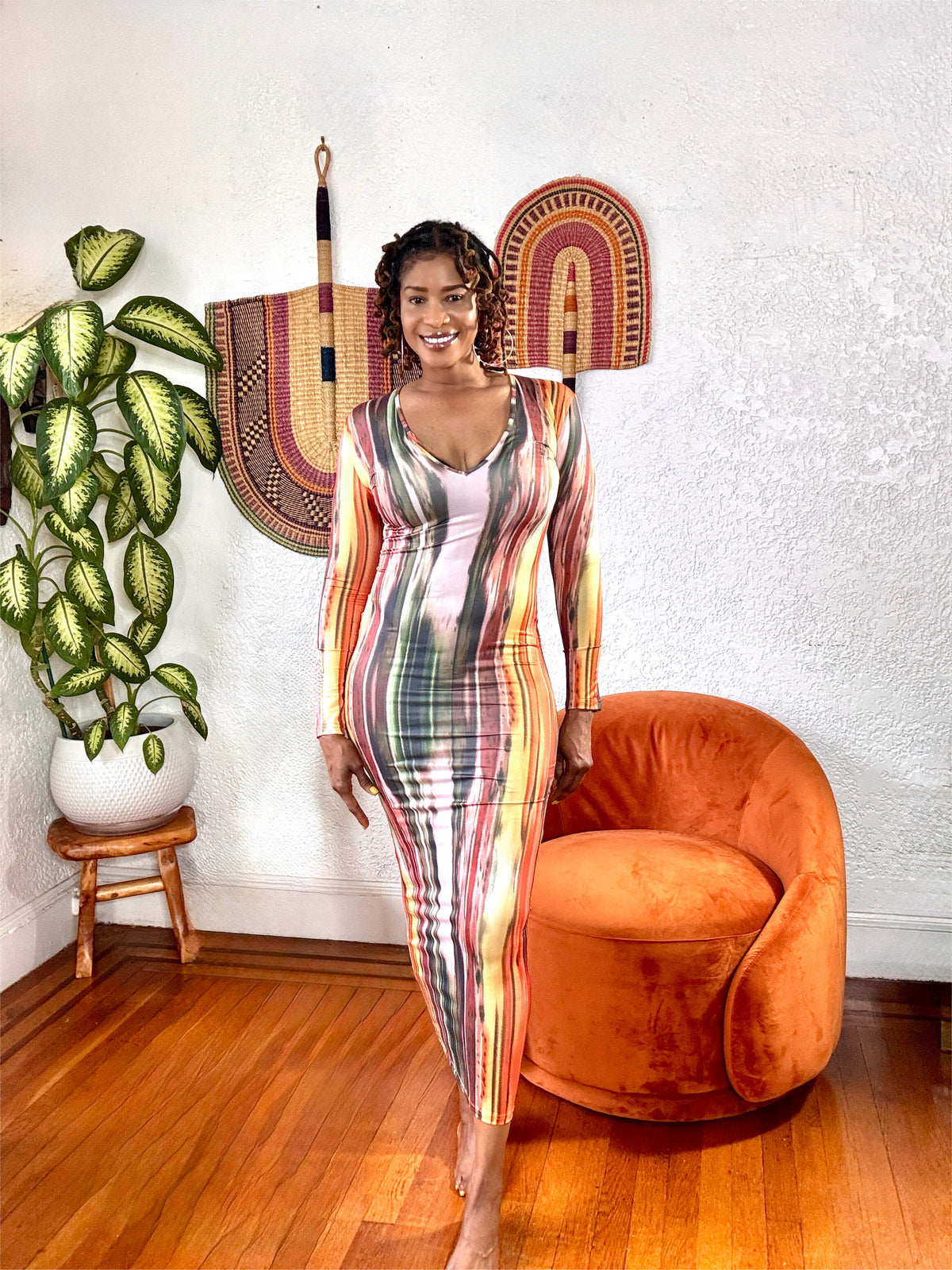Turn heads in this long-sleeve maxi that feels like wearable art. Featuring a vibrant abstract splash of greens, purples, blues, and pinks, this statement piece is made for the woman who walks with confidence. With its curve-hugging stretch fabric, deep V-neckline, and dramatic length, it’s a mood for any occasion—brunch, date night, or a gallery stroll.