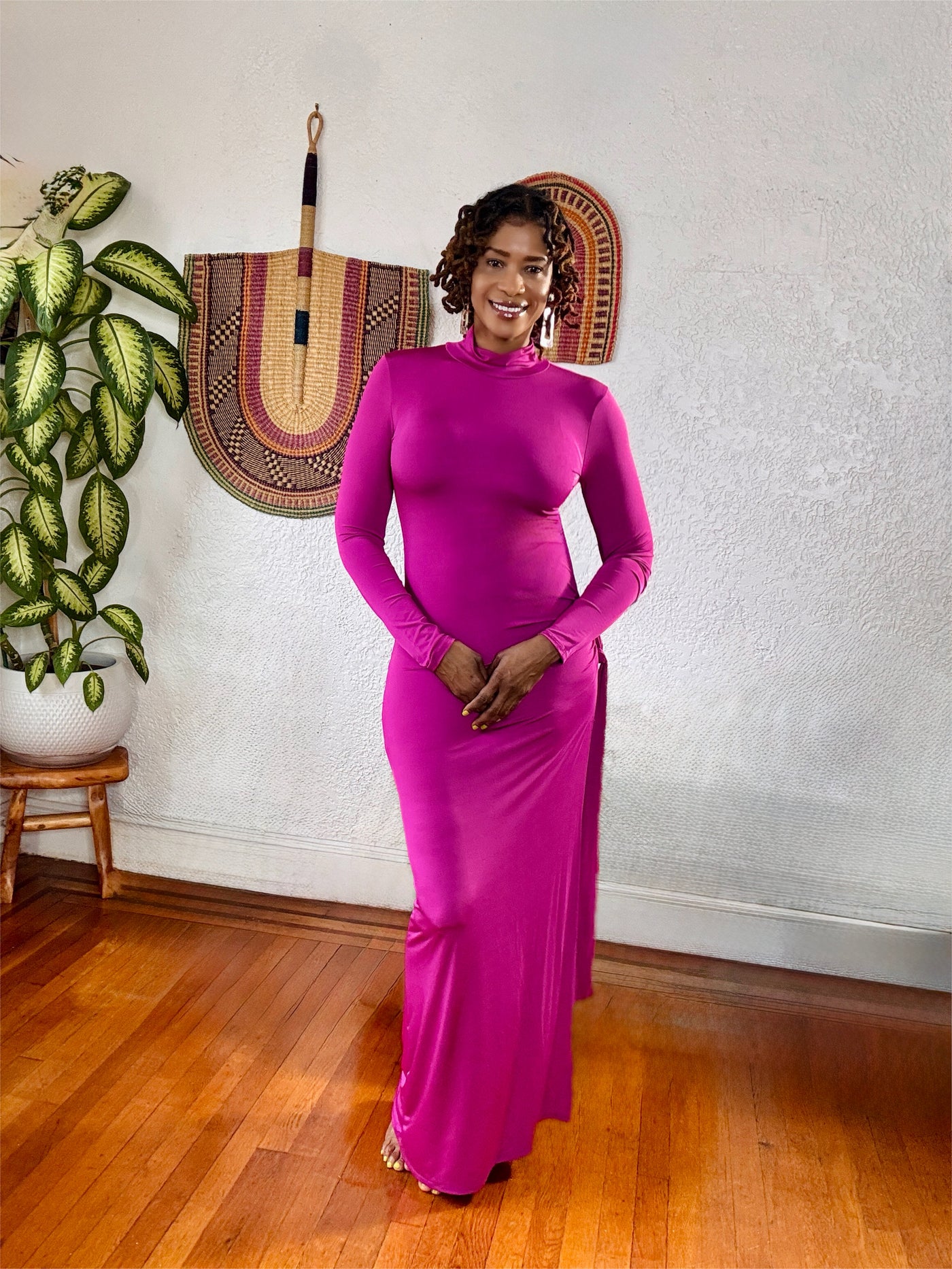 Command the room with effortless grace in the Magenta Muse Maxi Dress. This bold, body-hugging silhouette features a sleek high neckline, long sleeves, and a daring thigh-high slit that delivers just the right amount of drama. Crafted from soft, stretch fabric that flatters your curves, this vibrant magenta piece is made for the woman who owns every stare.